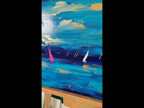 Ce tableau de la collection "Marines" est peint au couteau sur une toile de 45 x 135 cm en technique mixte.
